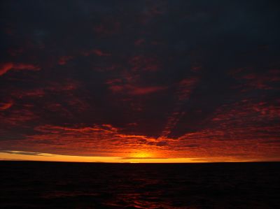 Slowly the layer of stratus that has accompanied us since we left Reykjavik 3 days ago gives way to warm sunshine. A gentle northerly breeze pushes us along. A few seconds before the sun rises, the night watch witnesses a “green ray”. Our physicist, Rob, spends the day elaborating all sorts of complex theories to explain this rare phenomenon, but we remain unconvinced.