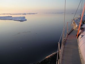 A 7h30, c'est "le pépin", l'un des safrans casse en heurtant un growler à pleine vitesse, nous effectuons une réparation provisoire à bord en vue d'une finition en Norvège. A 14h30, nous quittons définitivement la glace.