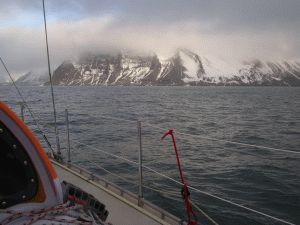 Malgré l'éloignement, nous ne sommes pas le seul voilier dans Hornsund. Nous croisons un ketch polonais et Vagabond qui vient d'arriver au Spitzberg. Echange de quelques mots amicaux, photos réciproques et promesses de rester en contact. Avec 2 ris dans la grand-voile nous tirons des bords à vitesse modérée entre les glaçons pour resortir du fjord qui est une véritable soufflerie dans laquelle une petite brise se transforme en coup de vent.