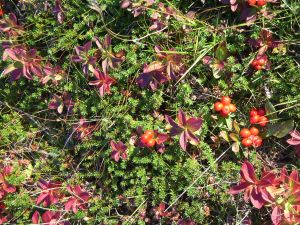 d'une petite rivière. Une forêt de bouleaux nains abrite de nombreuses plantes aux feuilles colorées et chargées de baies de toutes les couleurs: myrtilles, airelles... il n'y a qu'à se baisser pour en ramasser par poignées entières.